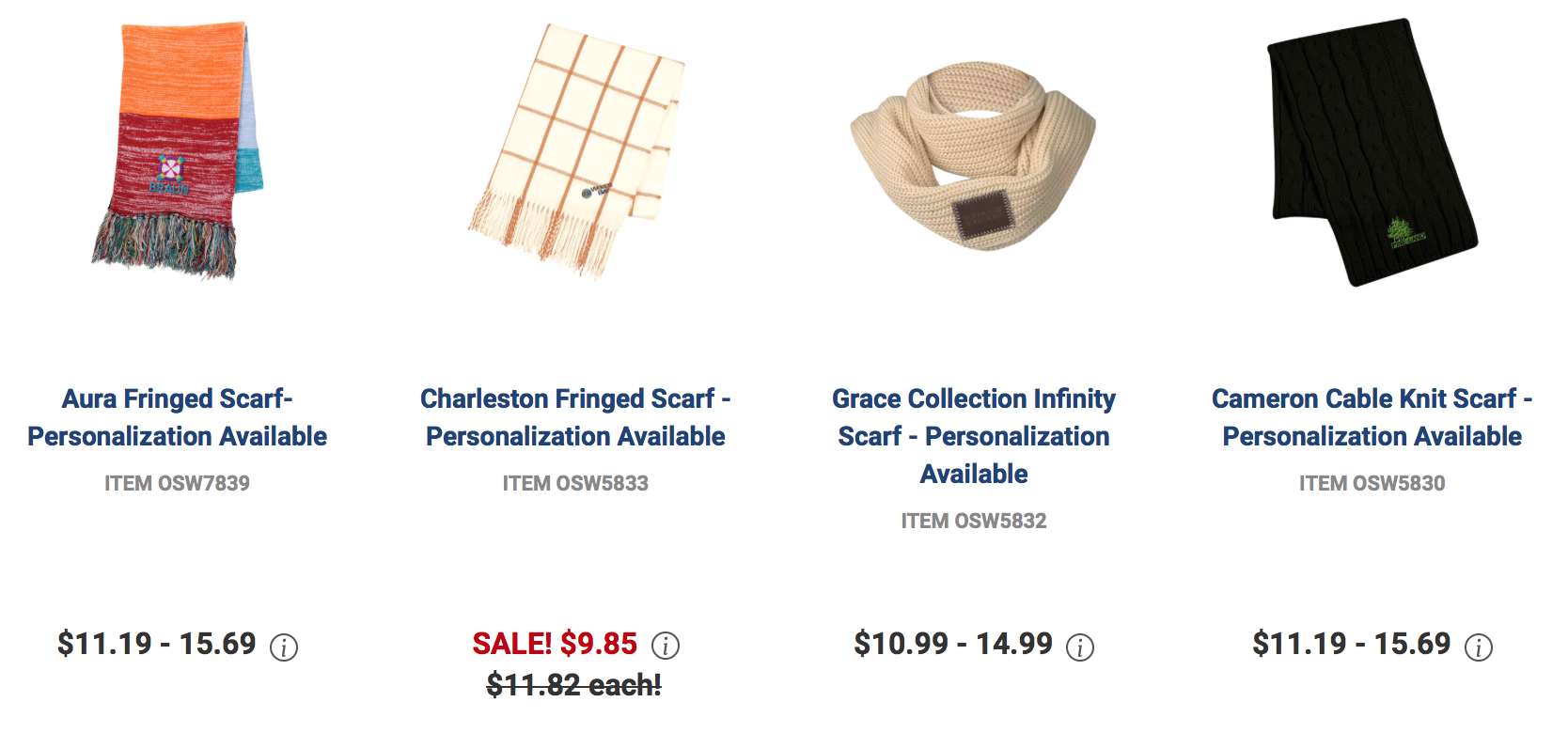 When it comes to buying in bulk, there are all different scarf styles that you could get on both Deluxe and Positive Promotions. The options on both sites vary- on Deluxe you can get a scarf apart of a gift set including a hat, gloves, a bag, etc., and on Positive Promotions you can get more of a variety.