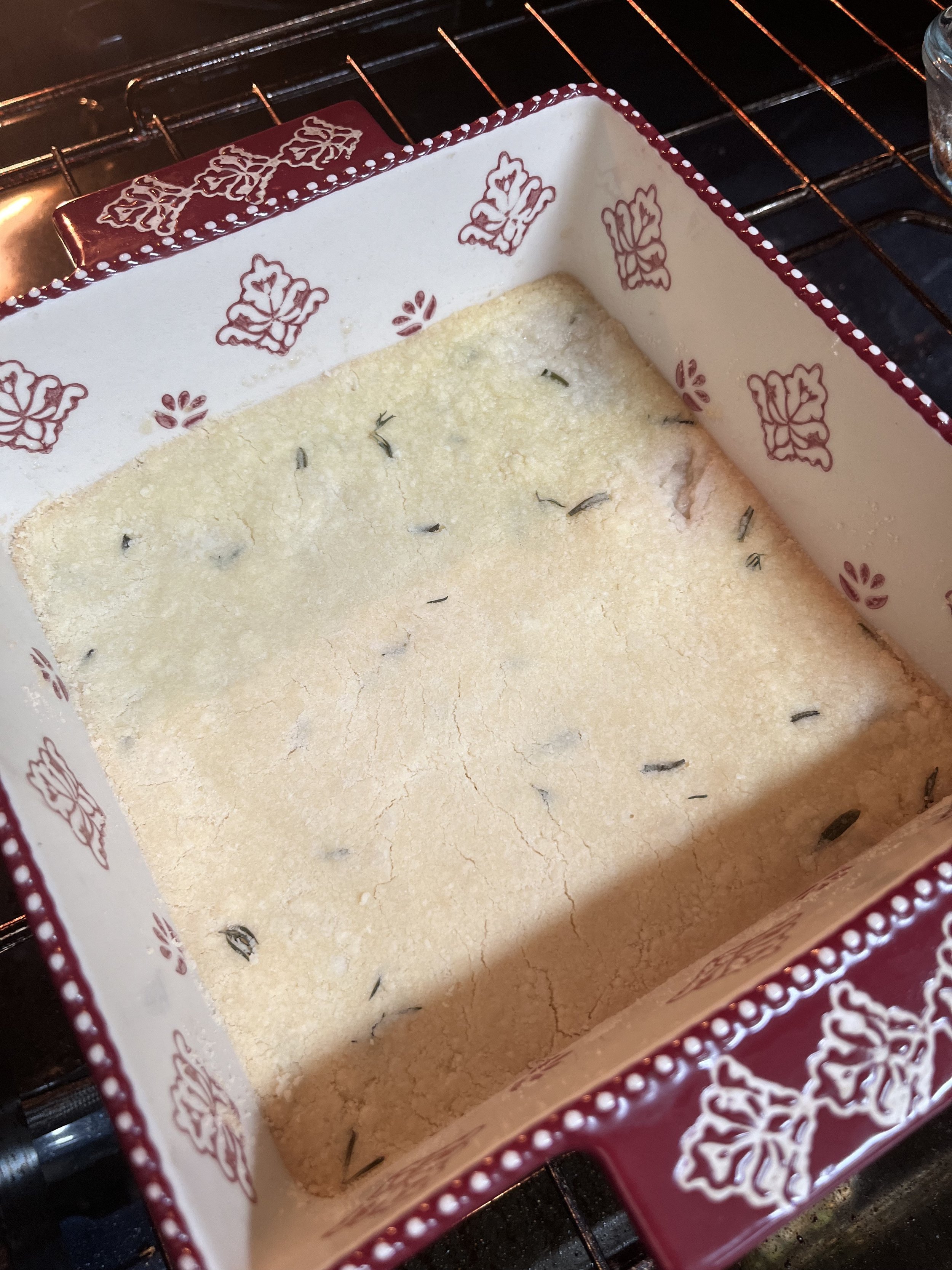 Preheat the over to 350 degrees. If you use a glass measuring cup with a spout, you can use it for all of these first ingredients - less dishes! Start with 1 cup of all flour, then add 1/4 cup powdered sugar, and 1/2 cup of softened or melted butter, which is 8 tablespoons. If you want to save washing a knife, use the same knife to cut the butter to cut a lemon in half (if you do this, you may want to zest the lemon first). I use the wrapper of the butter to wipe the bottom and corners of the baking pan, but you can also use cooking spray. You can microwave the butter but don’t over do it, I find butter is melted enough after about 20 seconds in the microwave. Add your herbs. You don’t need to measure, but around 1-2tsp per herb sounds about right. I recommend eyeballing the volume of herbs in the dough according to how strong you want the herbal essences to shine through. If using multiple herbs, try and match the ratio of each herb to not overpower (unless that’s your goal). I find 2-4 sprigs of Thyme and 1 bushy Rosemary sprig do the trick. I pinch and tear the herbs to make them small and avoid dishes, but you can also chop them. Mix everything together with the whisk, using the rubber spatula to push the ingredients of of the side of the bowl to combine. Once well combined, spread into a 9x13 or similar volume pan(s). You’ll want this crust to be about 1/2 inch tall. Once you’ve evenly spread the crust dough, use the back of a spoon to push it down and flatten it out evenly. Bake for 20 minutes at 350.